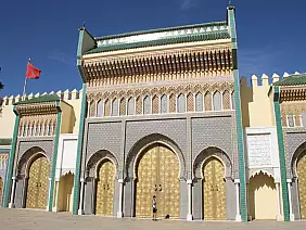 Fès, spesso definita la capitale culturale del Paese è la più antica delle quattro città imperiali e con la sua medina, Fès el-Bali, fatiscente e facile da perdersi costituisce la zona urbana pedonale più vasta del mondo. Scendiamo davanti al Palazzo Reale, costruito fuori dalla vecchia medina in prossimità del quartiere ebraico, qui l’unica cosa visibile al pubblico sono gli imponenti portali in ottone scolpito decorati con zellige (un assemblaggio di piastrelle tagliate in terracotta smaltata che riproducono un disegno geometrico) ed elaborati elementi in legno di cedro intagliato.